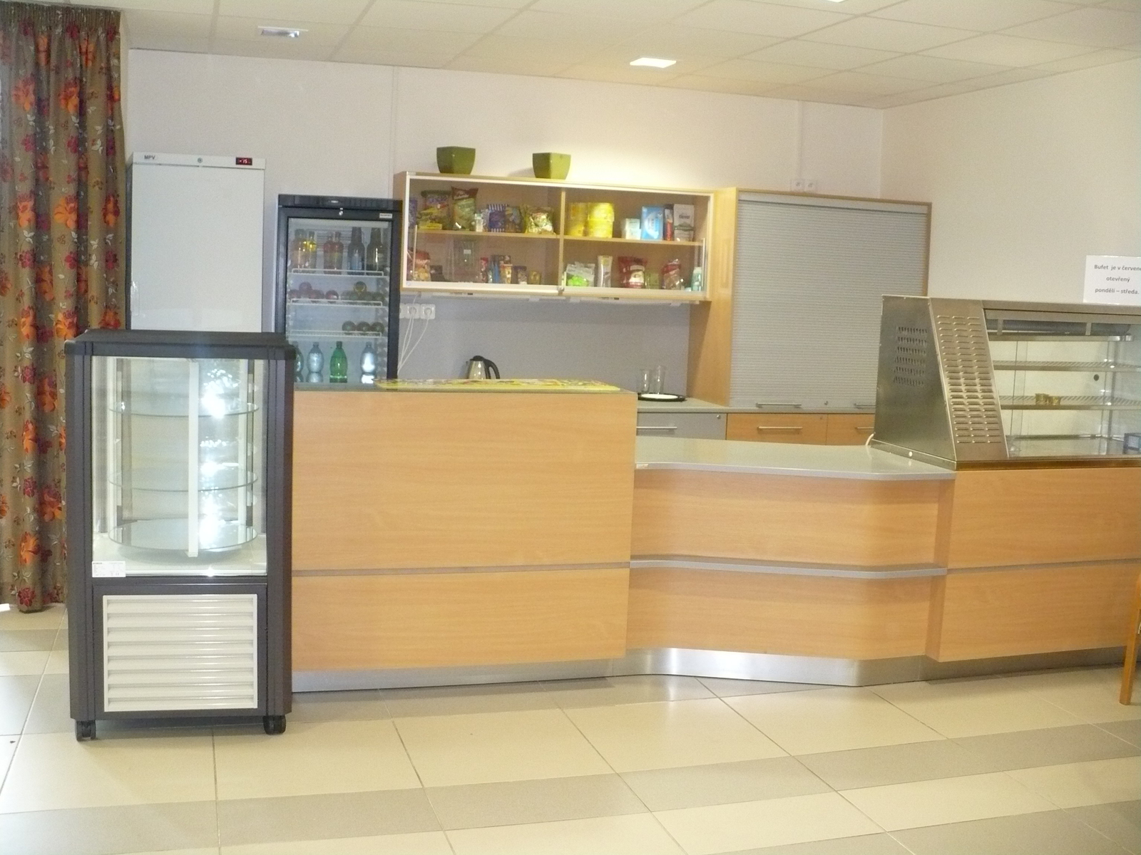 Bufet je zařízený, součástí je chladnička, mraznička, prodejní pult s vitrínou.