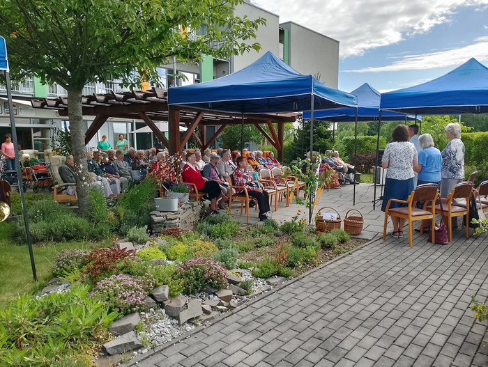 Chtěli bychom také poděkovat všem, co se podíleli na přípravách a realizaci bohoslužby. Dík patří panu děkanovi, který vlastně přišel s nápadem přesunout se z domovní kaple na zahrádku. Děkujeme panu Prudíkovi a jeho celé kapele, že nás provázeli nejen bohoslužbou, ale ještě přidali pár lidovek. A velké poděkování posíláme veliteli hasičské stanice panu Jiřímu Doležalovi za půjčení stanů, které nás chránily před sluníčkem!!