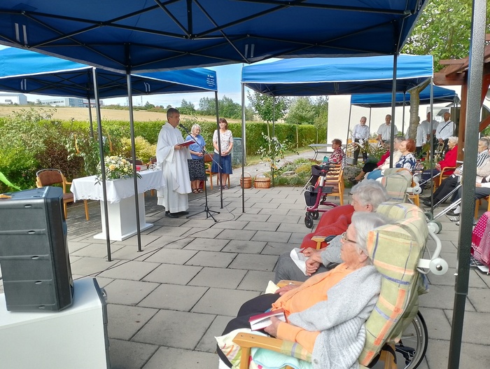Dnes v dopoledních hodinách se u nás v terapeutické zahrádce konala poutní Mše svatá k slavnosti Proměnění Páně. Mši sloužil náš pan děkan Jiří Kaňa a jako hudební doprovod přijal pozvání pan Ladislav Prudík s kapelou. Zahradní bohoslužby se účastnili i naši sousedé z pečovatelského domu.