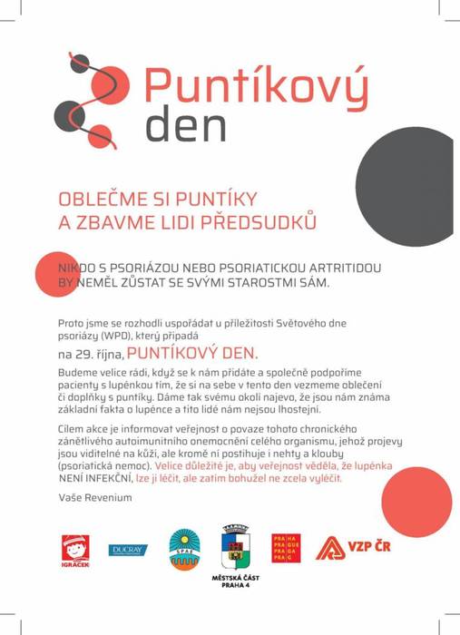 Puntíkový den?? Tento den totiž vyjadřuje podporu všem lidem, kteří onemocněli psoriázou (tedy lupenkou). Puntíkový vzor pomáhá vytvořit světu osvětu, že lupenka není infekční a nikdo s psoriázou nebo psoriatickou artritidou by neměl zůstat se svými starostmi sám.