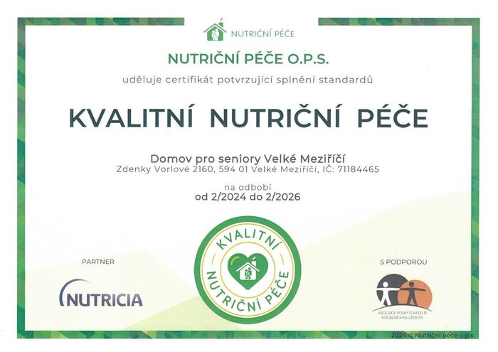 Náš Domov získal Známku KNP - tedy certifikát potvrzující splnění standardů kvalitní nutriční péče! Certifikace je zárukou toho, že naše organizace poskytuje obyvatelům kvalitní, regionální a sezónní stravu odpovídající jejich individuální potřebě, omezení a nutriční diagnóze.