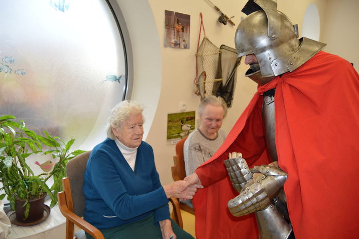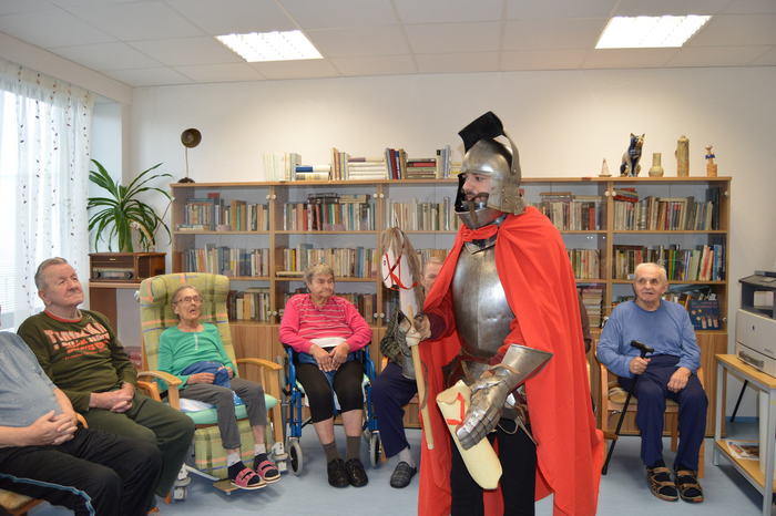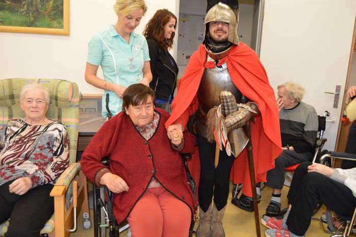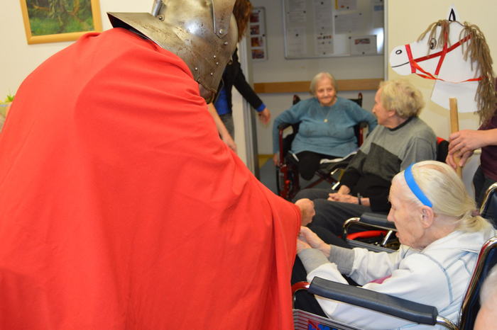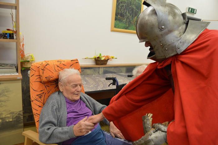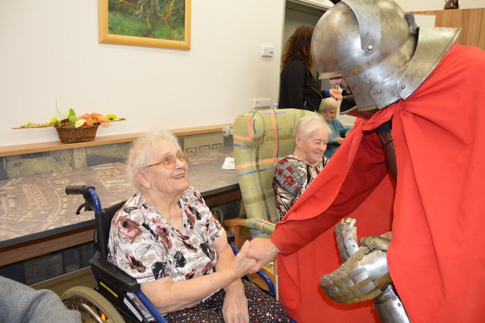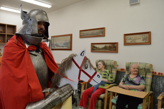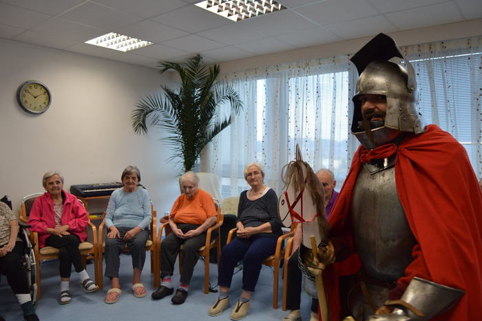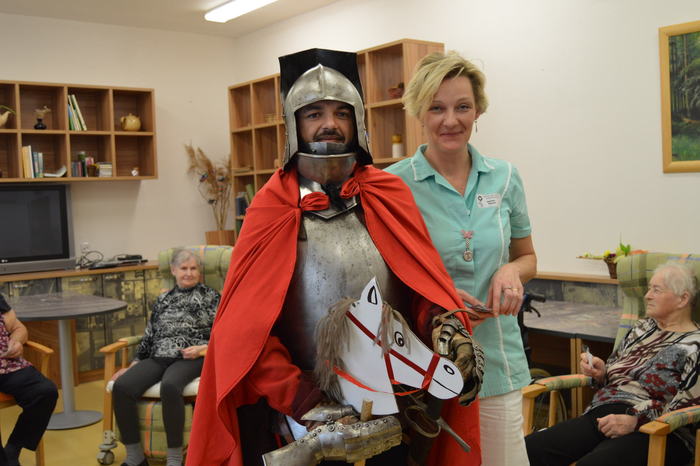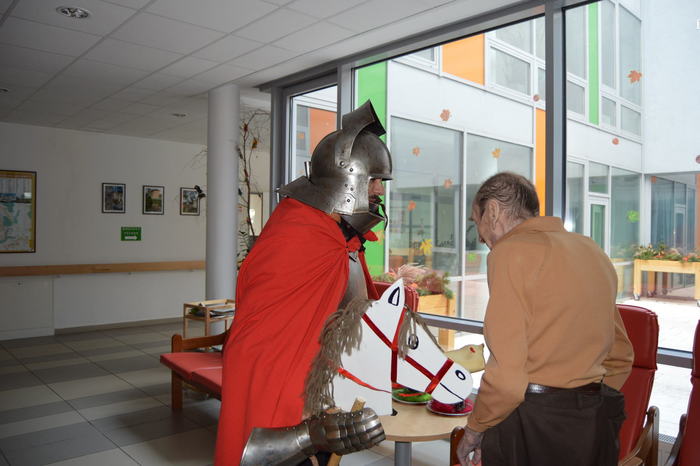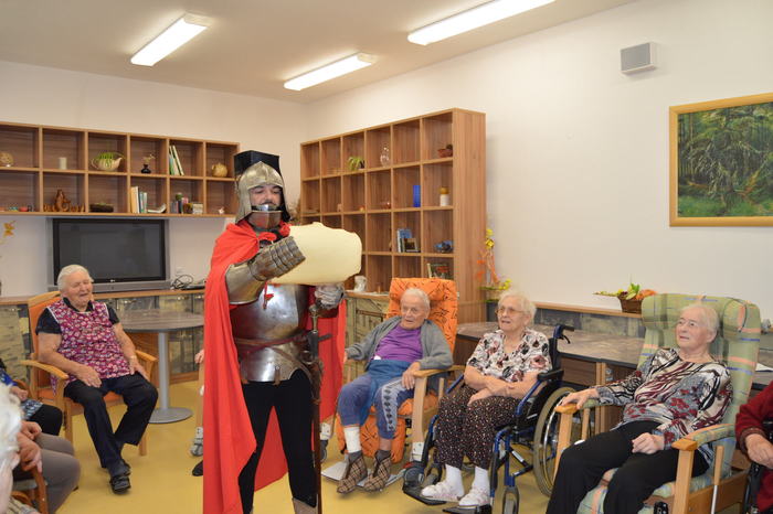 S drobným zpožděním i do našeho domova přijel svatý Martin na bílém koni. Proti loňskému roku se kůň mírně zmenšil a možná proto trvala Martinovi cesta tak dlouho. Ve svém brnění a pověstném plášti měl ale u našich obyvatel úspěch. Na všech poschodích si pro klienty připravil krátkou zdravici a přečetl poselství. Zájemcům propůjčil na ozkoušení svou přilbici. Každého z našich obyvatel obdaroval zlatým penízkem pro štěstí.