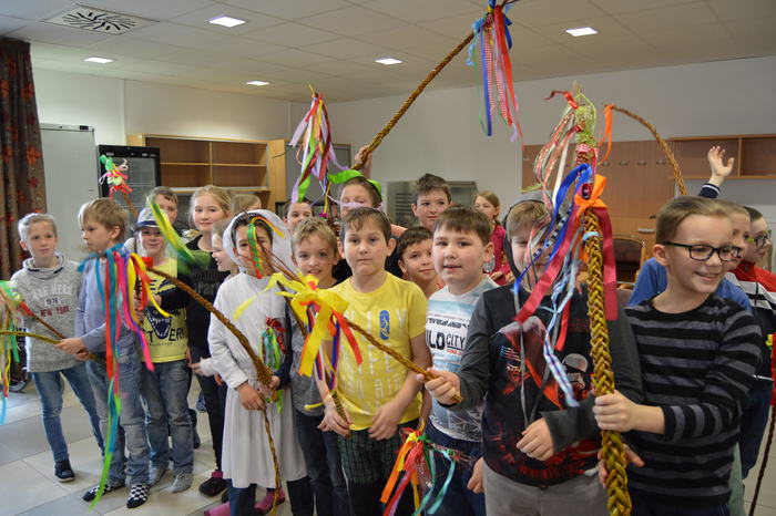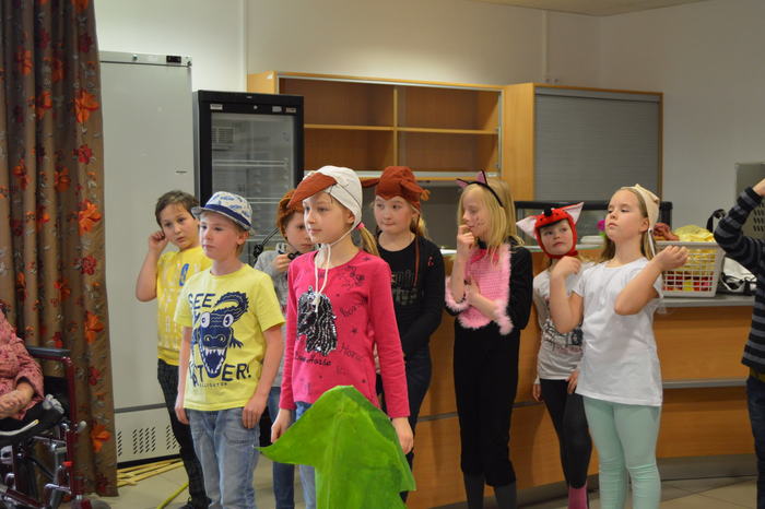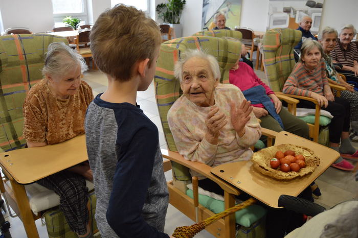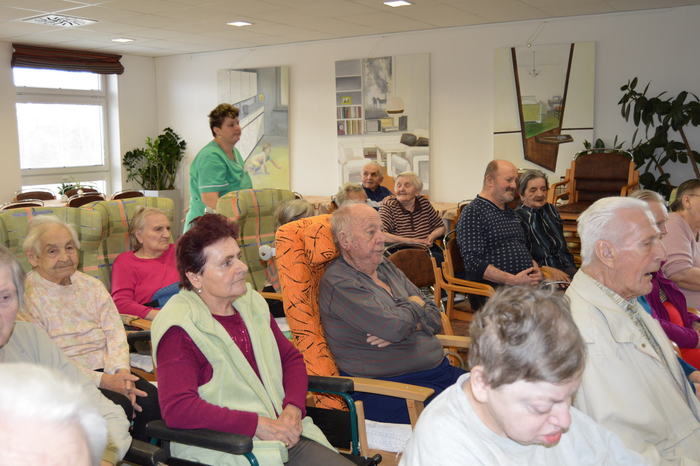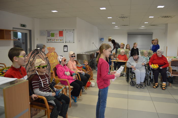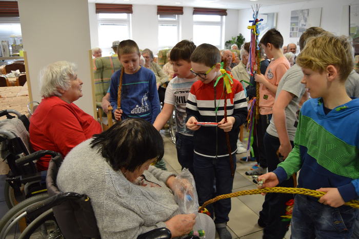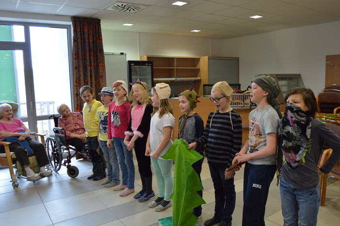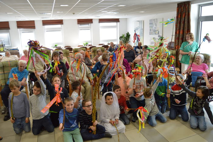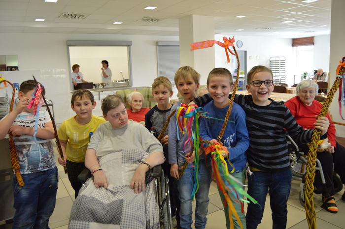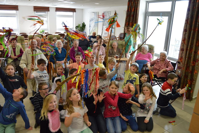 V domově jsme si udělali místo Velikonočního pondělí Velikonoční úterý, kdy za námi přišli žáci ZŠ Školní. Kluci trefně prohlásili, že se jedná o "Akci Velikonoce". Děti nám zahrály divadelní pohádky O třech prasátkách, O Šípkové Růžence a O vajíčku. Po odehraném představení se hoši ujali mrskaček a přítomné ženy vyšlehali, aby nám neuschly.