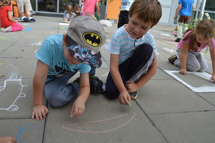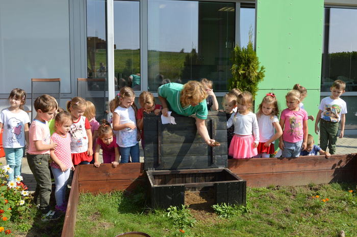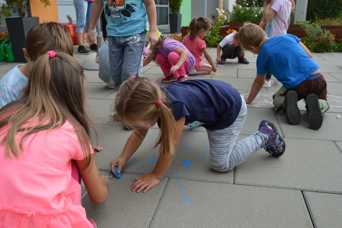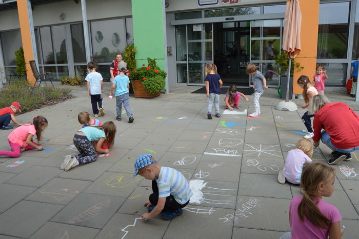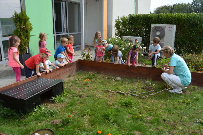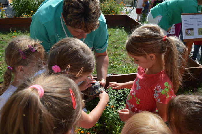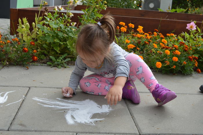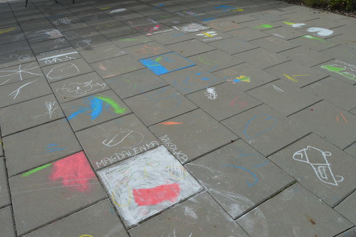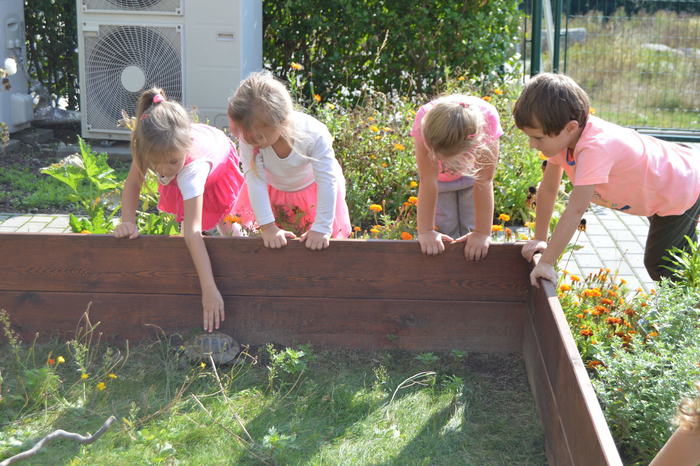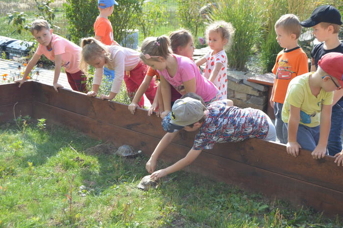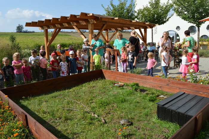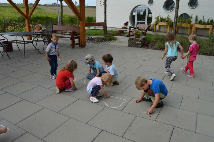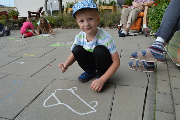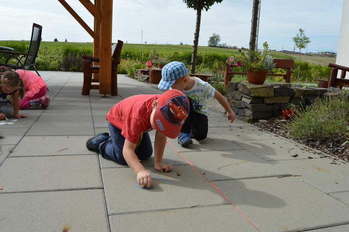Během září nás několikrát navštívily děti z mateřské školy Oslavické. Malé Veverky se k nám přišly podívat na želvy, které jsou u nás na prázdninách z jihlavské ZOO. Jeden den se také věnovaly výzdobě naší zahrádky a pořádně nám ji pomalovaly křídami, aby tu bylo příjemně a veselo.