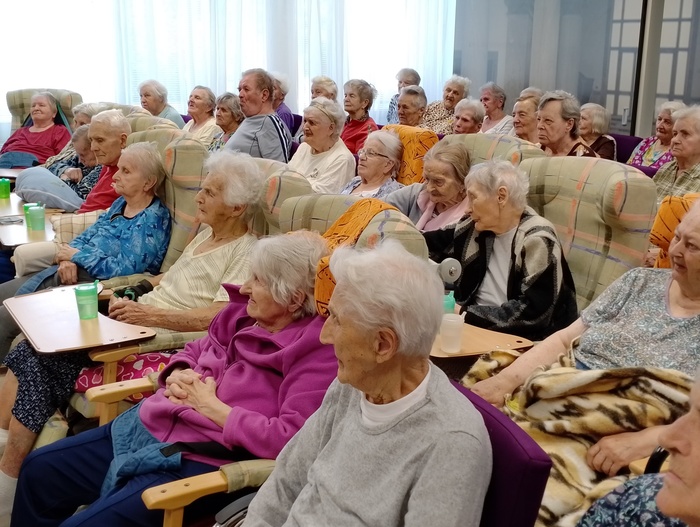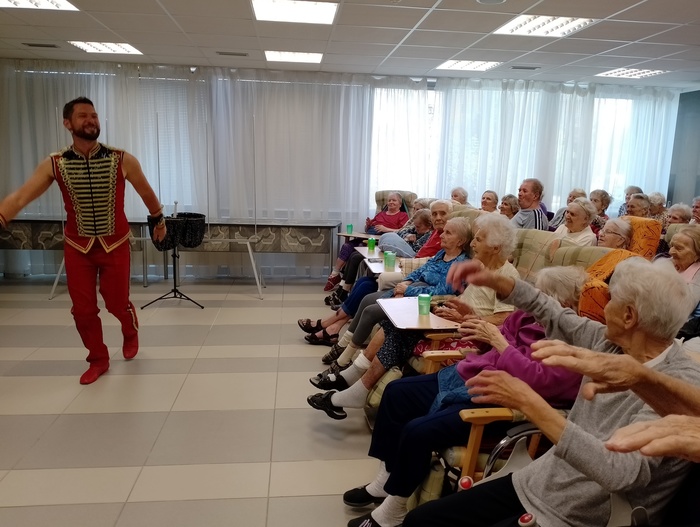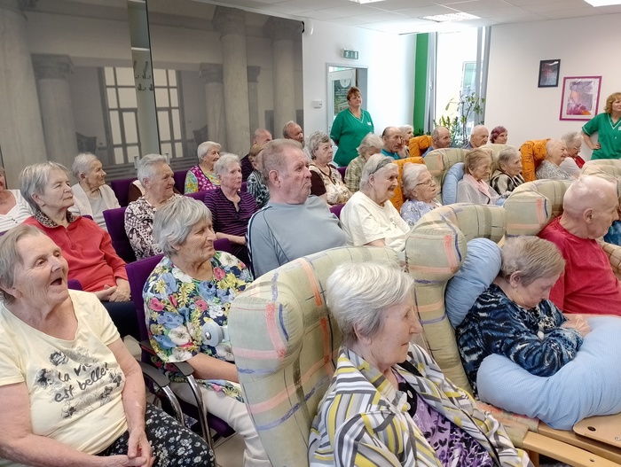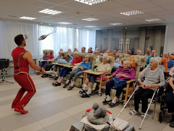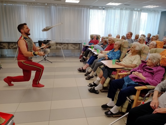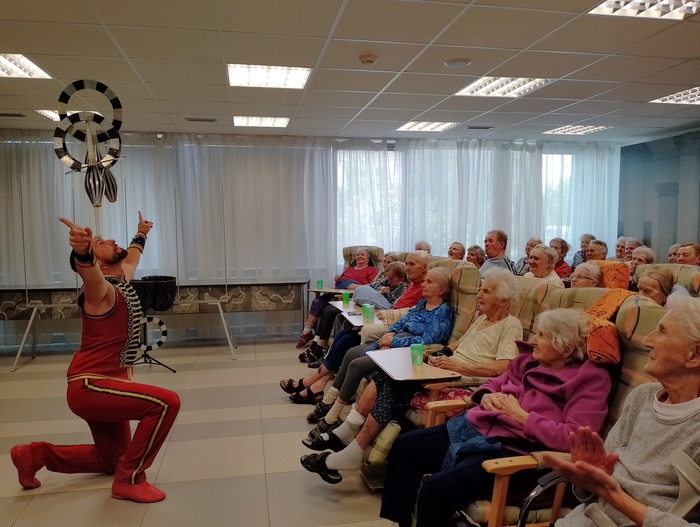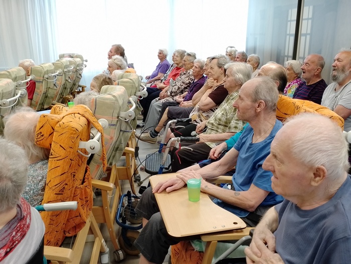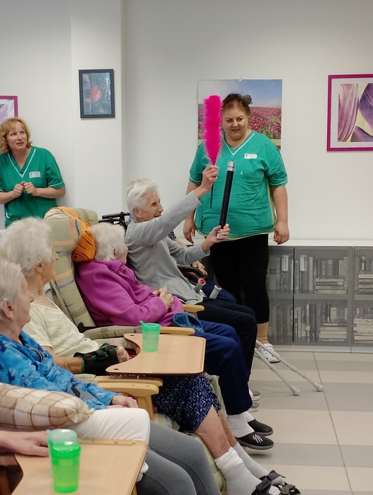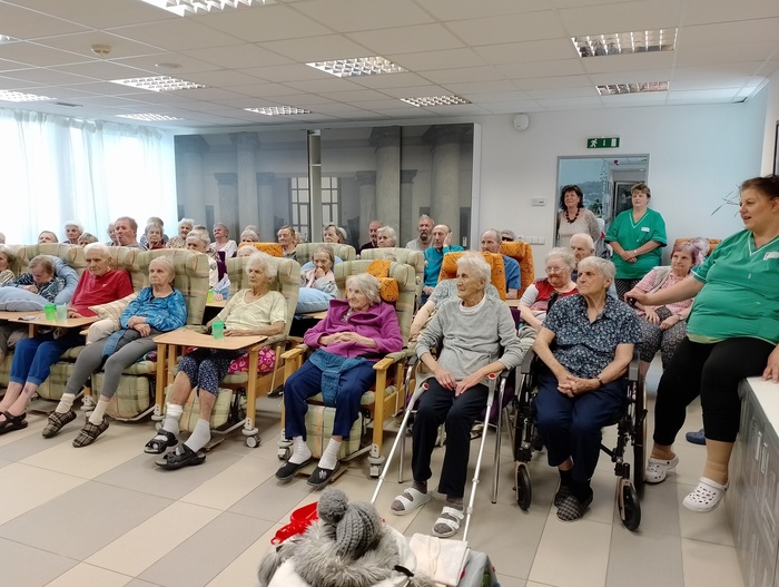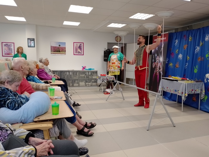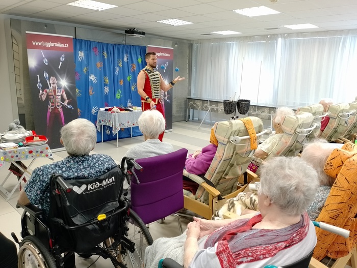 Dnešní dopoledne 3. července nás přijel pobavit žonglér pan Milan Osmera z Třebíče. Vystoupení jsme si parádně užili. Po celou dobu programu jsme se jen smáli a žasli nad kousky, které nám představil. Vyčaroval úsměvy na tvářích celému publiku. Žongloval s kroužky, talíři a míčky, dokonce balancoval s berlí naší obyvatelky. Dosud vlastně nevíme, jak jsou některé z jeho kousků možné. Pokud se chcete odreagovat, můžeme vřele doporučit. Představení bylo nabité energií a my ještě jednou mockrát děkujeme za krásnou atmosféru!!