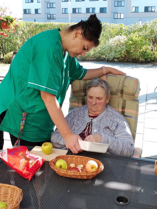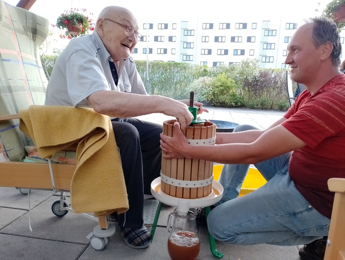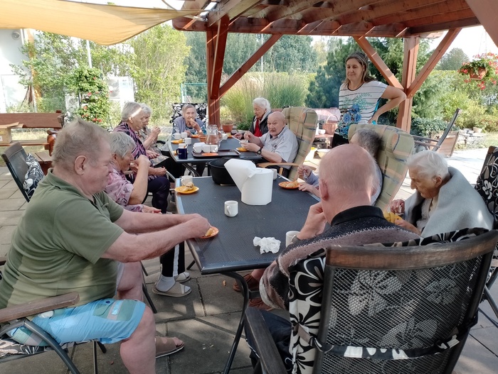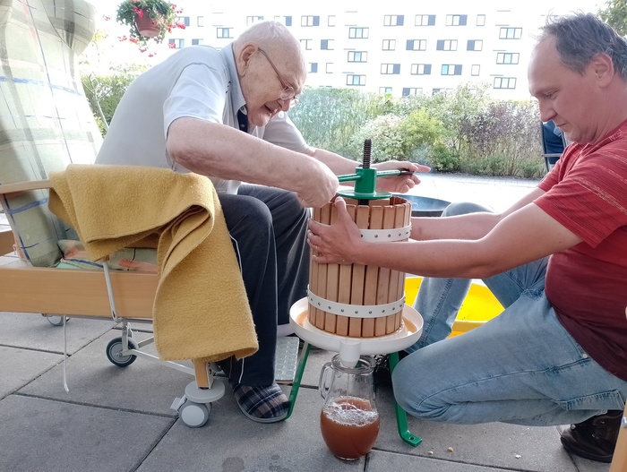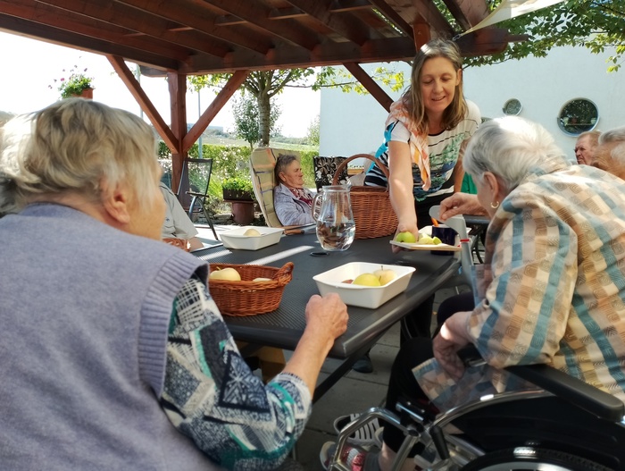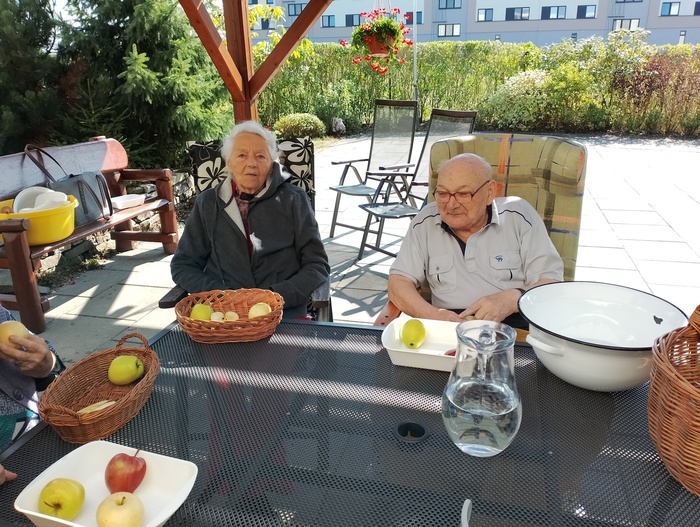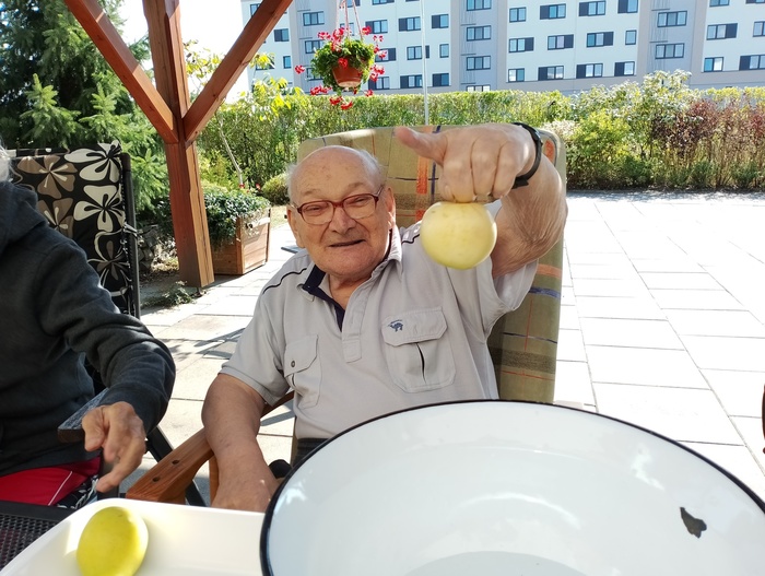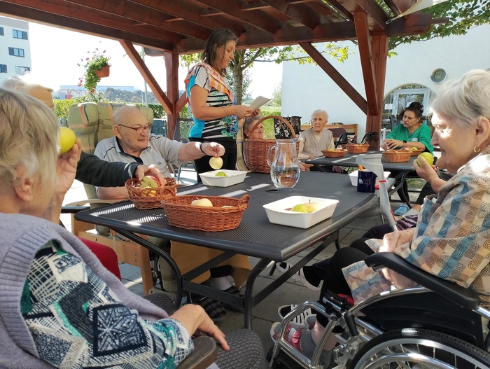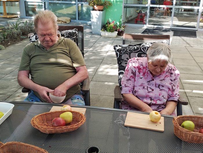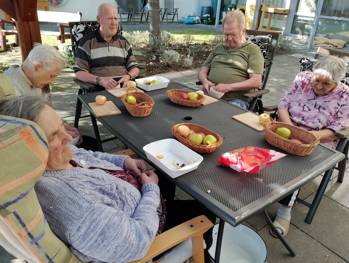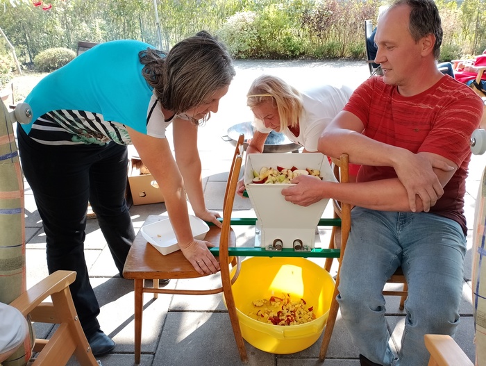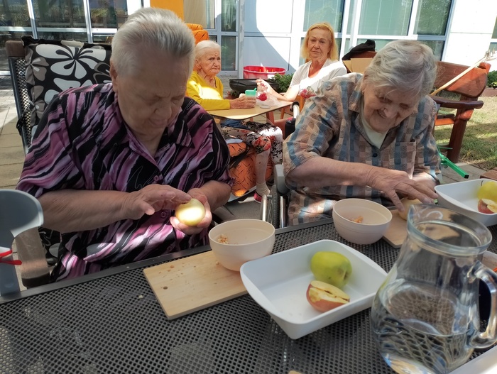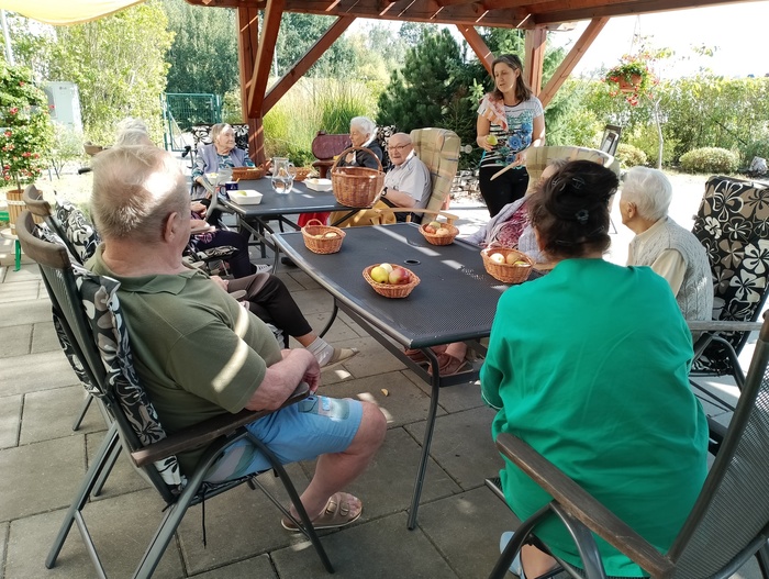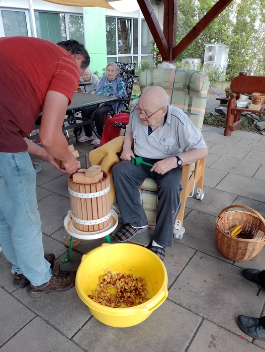 Ze zahrádky se stále dá sklízet spoustu plodů i plodin. Zahradnický kroužek nás tedy zavedl k nejznámějšímu ovoci - jablku. Dozvěděli jsme se zajímavosti o odrůdách Gala a Golden a vyrobili jsme si nádivku z piškotů, rozinek, másla a skořice. Nádivkou jsme vycpali vydlabaná jablka, která jsme předtím zbavili jadřince. Po rozdělání ohně a během pečení slaďoučkých jablíček, jsme se pustili do přípravy moštu. A potom už byla na řadě samotná degustace.